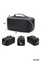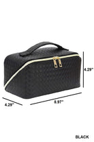 WOVEN VEGAN LEATHER COSMETIC MAKEUP TRAVEL BAG - PORTABLE AND STYLISH MAKEUP ORGANIZER - 180-DEGREE WIDE OPENING - LAYERED WITH 2 COMPARTMENTS AND 4 SMALL POCKETS - EASIER ACCESS DESIGN - SUITABLE FOR ALL KINDS OF USE - HIGH-QUALITY ZIPPER ENCLOSURE - STURDY AND PORTABLE CARRYING HANDLE - WEAR RESISTANT AND EASY TO CLEAN - WIDTH: 8.97", HEIGHT: 4.29", DEPTH: 4.29"