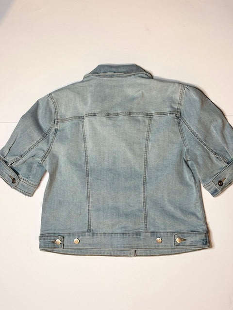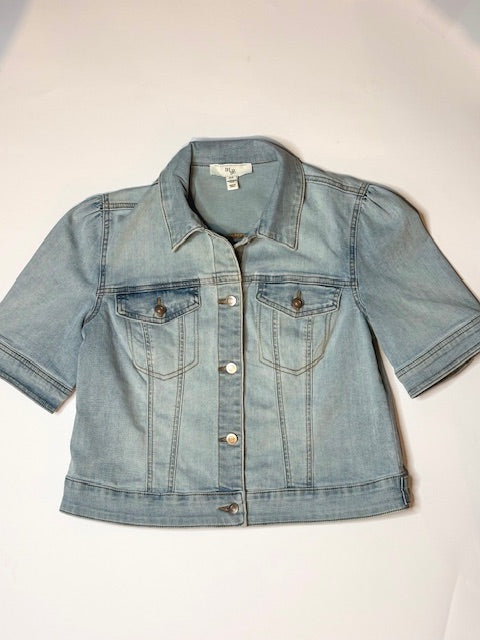 This cropped denim jacket is a fresh update on a classic wardrobe staple. Featuring a relaxed fit with short sleeves and chest flap pockets, it blends casual style with a modern edge. The subtle distressing add a vintage-inspired vibe, making it perfect for layering over dresses, tanks, or tees. With its lightweight feel and versatile design, this jacket is an essential piece for transitional weather or creating laid-back looks.