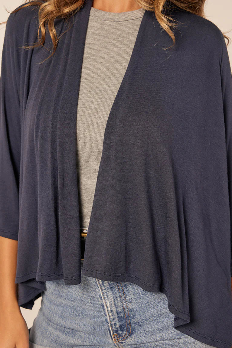 Meet the Joss Card, made of soft spandex fabric. Perfect for chilly restaurant nights and travel-friendly—just throw it in your bag without the worry of wrinkles! Features 3/4 sleeves, and an asymmetrical hemline with a relax fit.