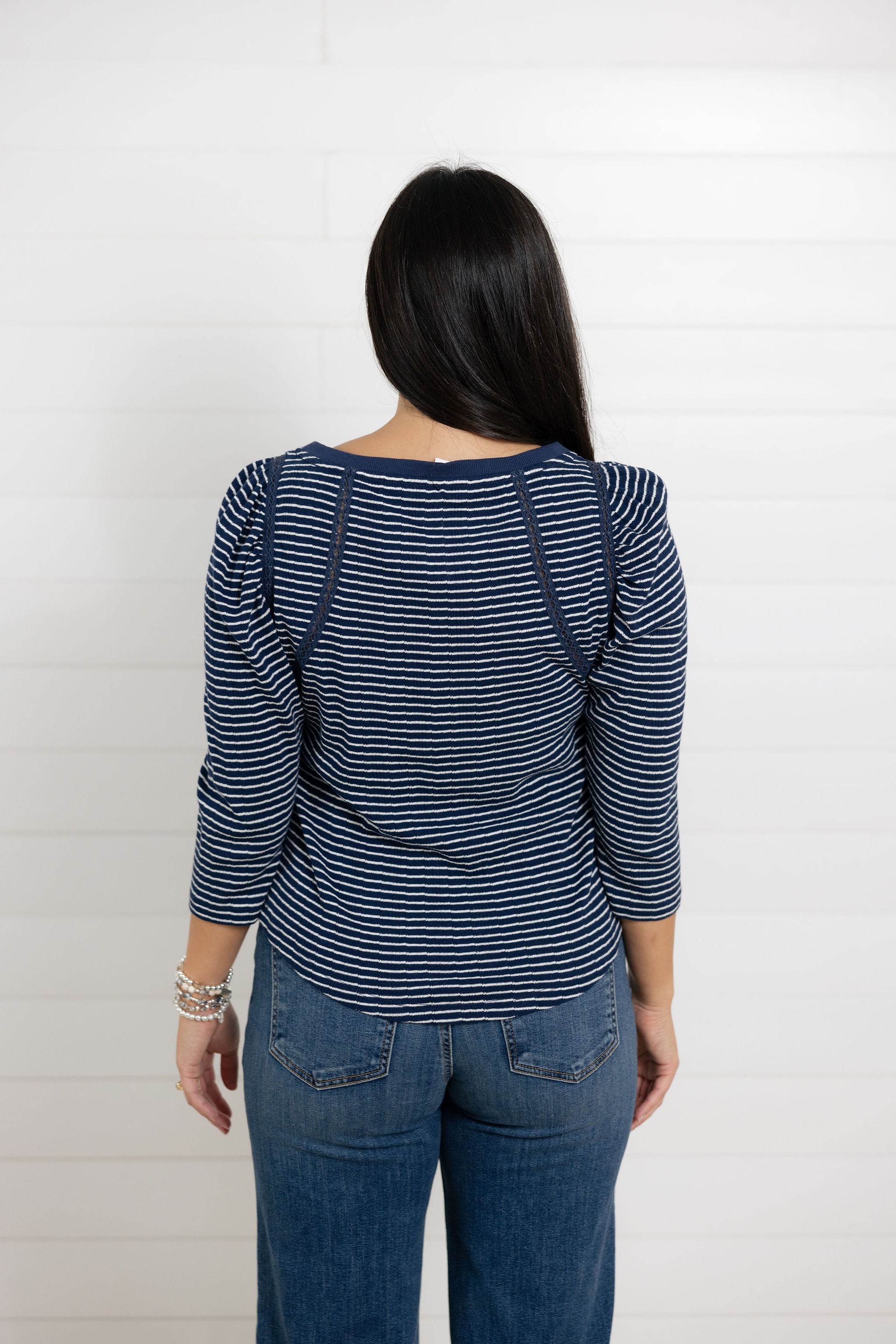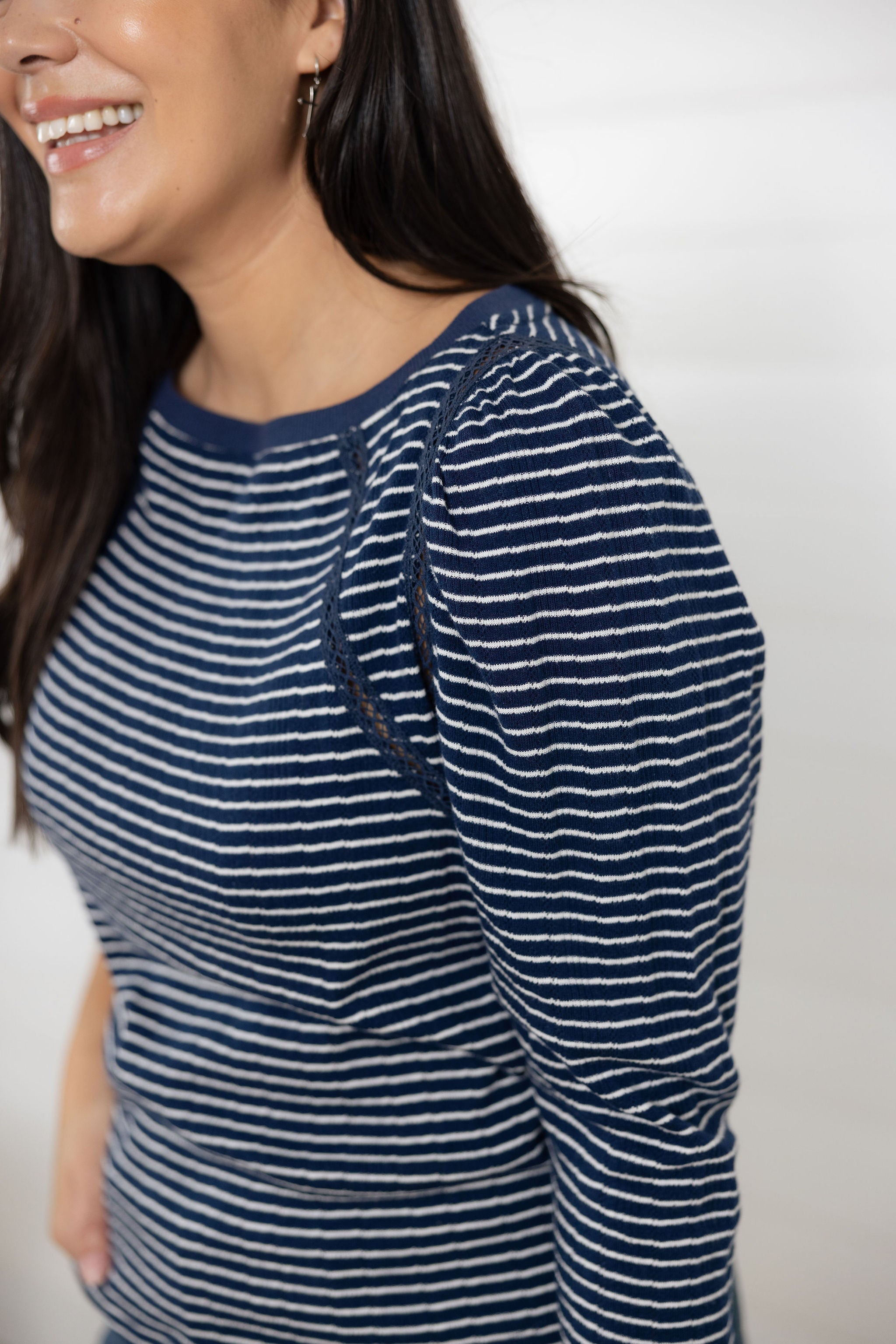 TheĀ Lace Inset Striped TopĀ is the perfect blend of easygoing and elevated. Made from soft cotton knit, this top features timeless stripes paired with delicate crochet detailing for a subtle, feminine upgrade. The boat neckline and three-quarter puff sleeves create a flattering, polished silhouette, while the round hem keeps it comfortable and easy to wear. Effortless yet special, this is one of those tops that instantly pulls an outfit together.