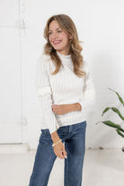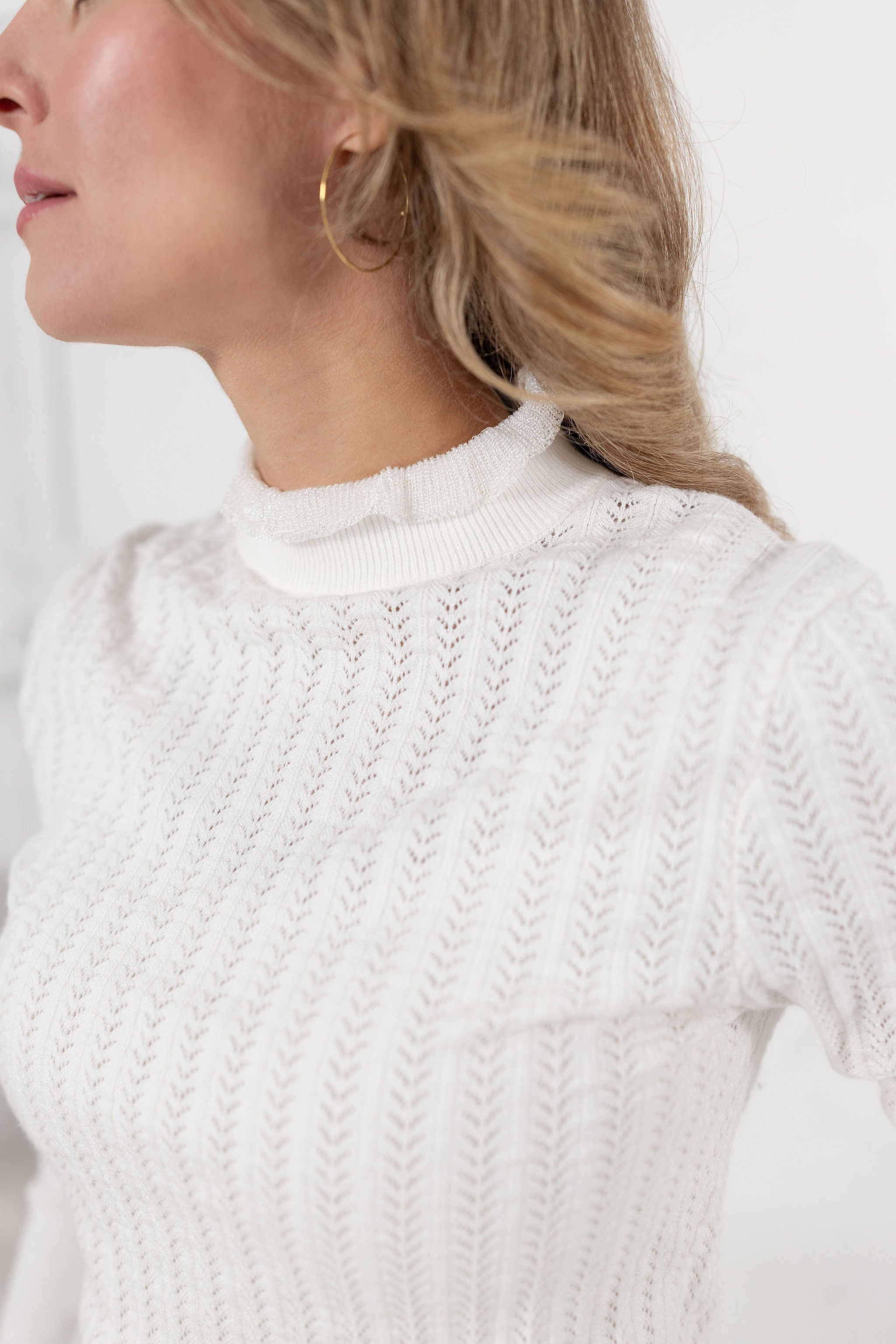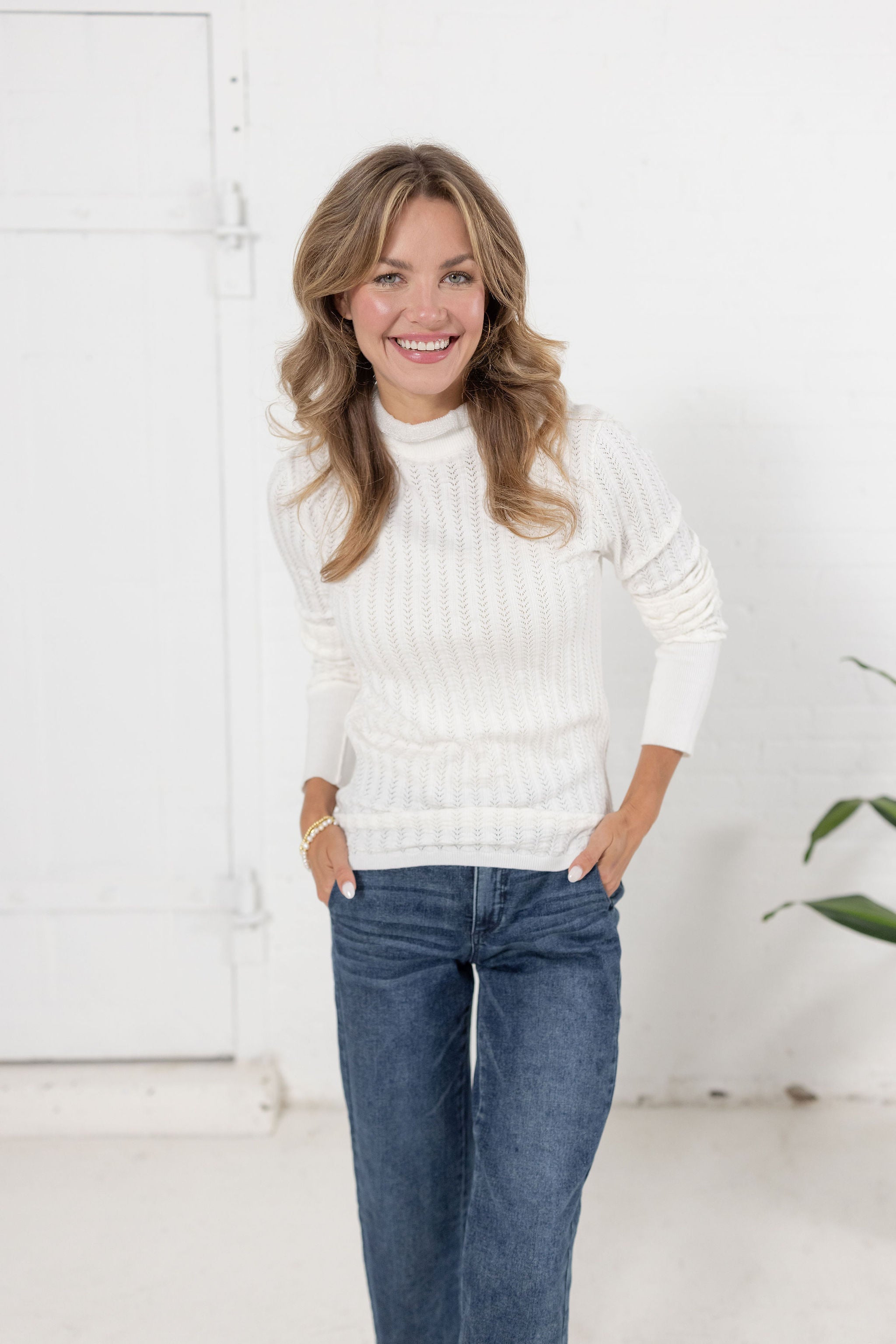 Elevate your sweater game with this pointelle style. It’s designed with long sleeves, a mock neck with beaded ruffle edge detailing, and a fit that looks great tucked in.