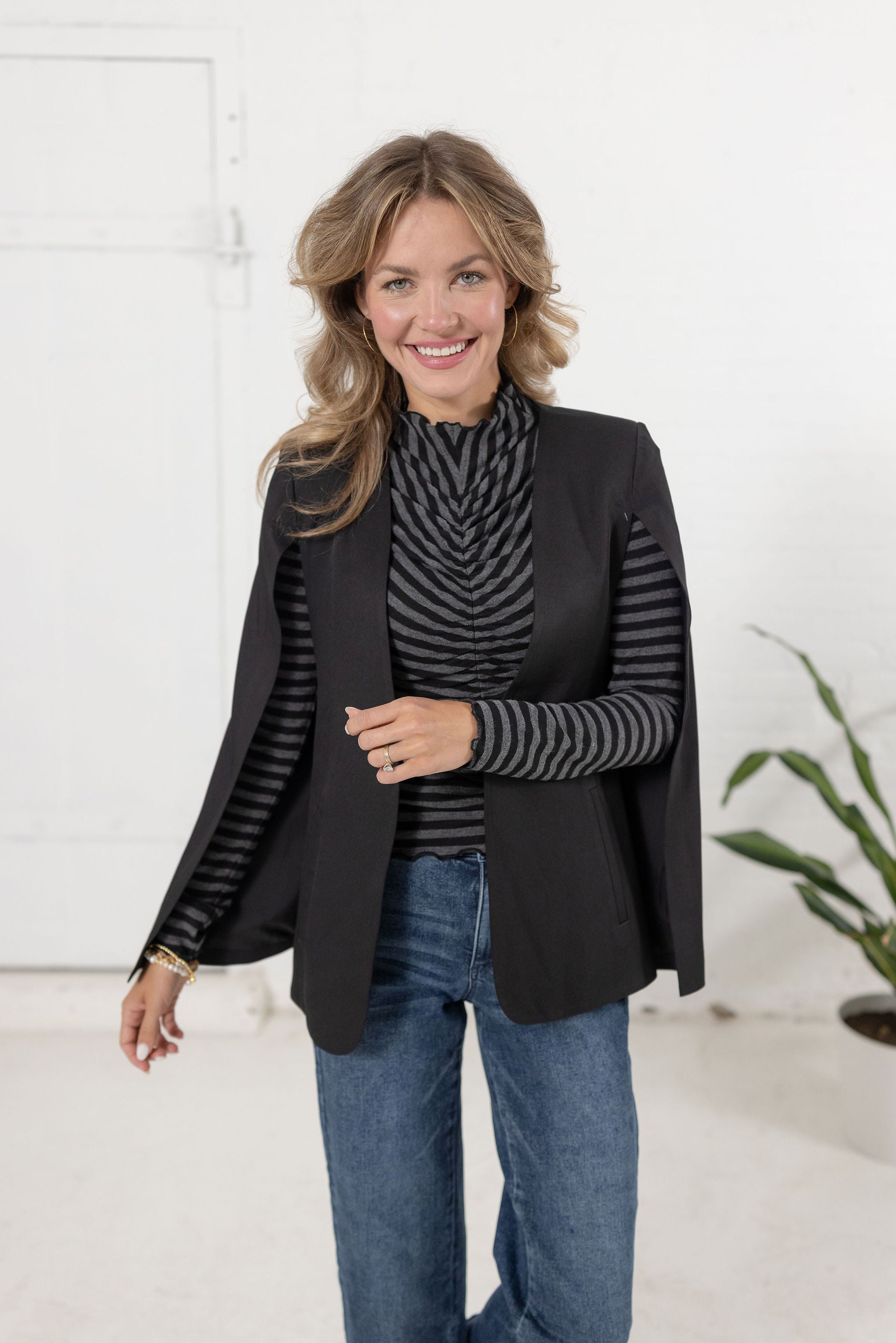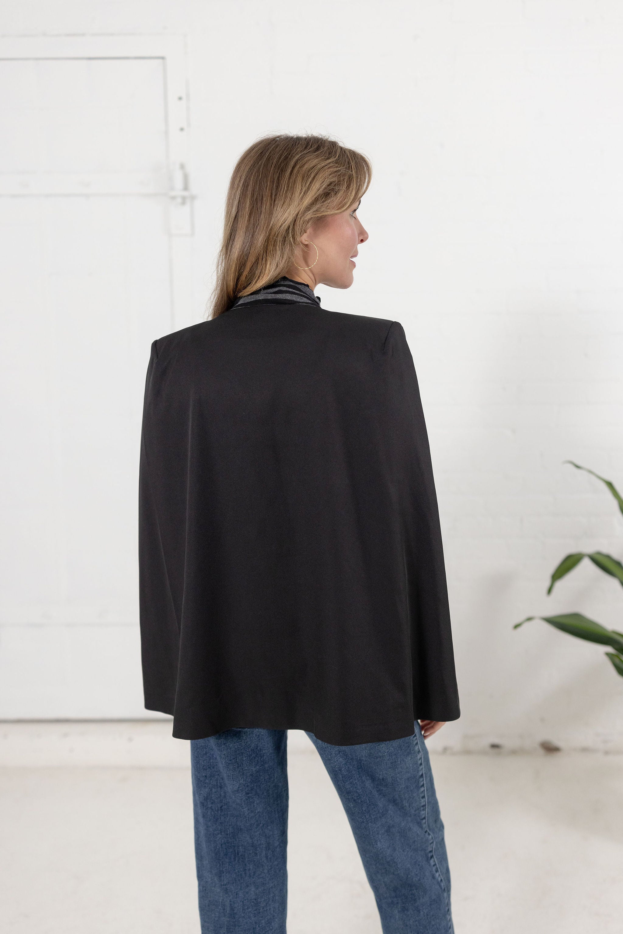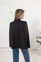 Make a statement with this one-of-a-kind Mac and Me Cape Jacket! Designed with hidden backband and armholes, it gives you the ease of a sleeveless jacket while draping beautifully like a cape. The result? A chic, flowy silhouette that layers effortlessly over any outfit. Equal parts polished and playful, this standout piece is your shortcut to instant style.