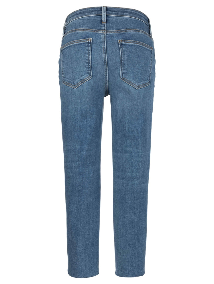 Petite-friendly mom jeans featuring a high-rise cut and fabricated AB stretch for responsive comfort. The 26.5" inseam delivers a precise fit for shorter frames, while as well as the ankle look the raw hem adds with a contemporary edge. Relaxed through the hip and thigh, these jeans balance ease with structure—ideal for creating polished, intentional looks across any occasion.