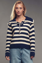This stylish sweater top features bold textured stripes and a unique cable knit pattern for a modern twist on a cozy classic. Crafted from a soft, chunky knit blend for warmth and comfort. - Wide ribbed collar with lace-up neckline adds vintage flair. - Chunky ribbed cuffs and hem for a snug, comfortable fit. *Fit : Relaxed, slightly cropped fit for easy layering.