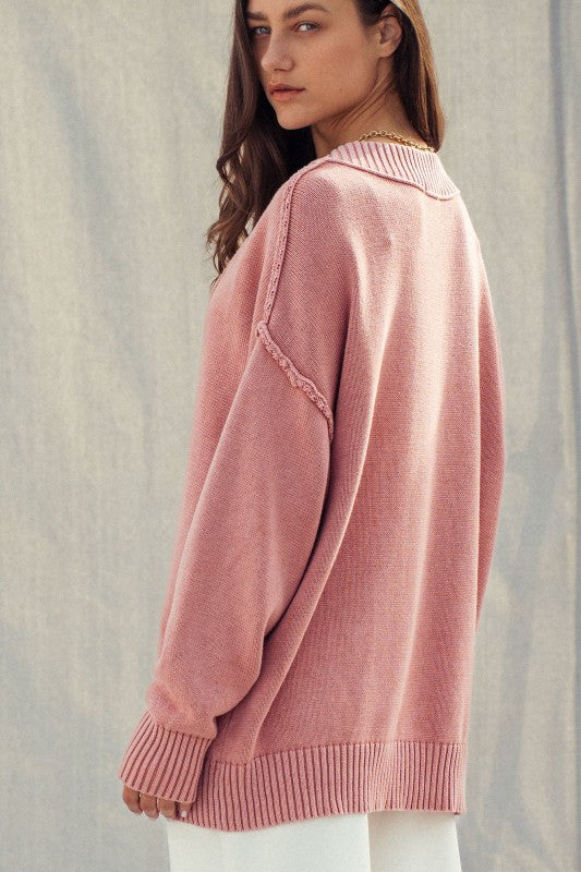 - Made from a soft knit with ribbed detailing along the neckline, cuffs, and hem for added texture and structure. The drop-shoulder design enhances its laid-back silhouette, while exposed seam accents add a subtle edge.