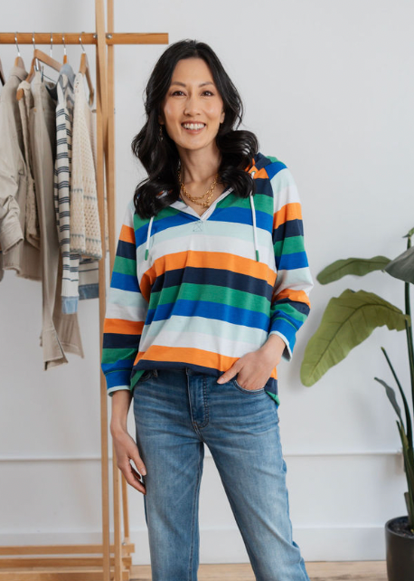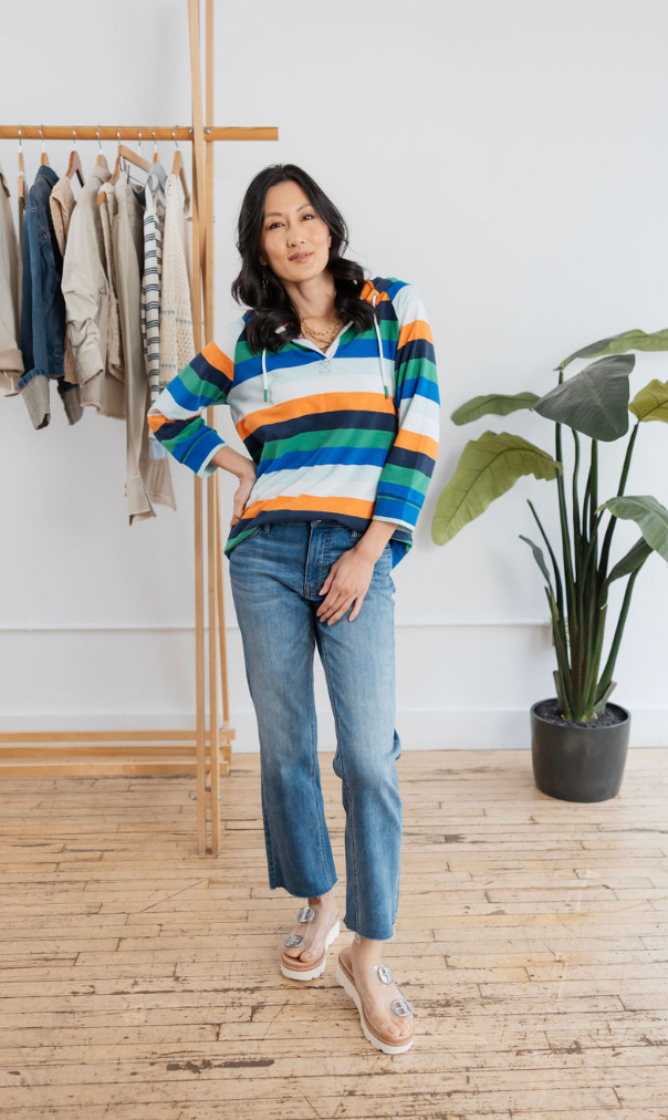 This vibrant hoodie combines comfort and style with its bold, multicolored stripe pattern. Crafted from soft, breathable fabric, it features a relaxed fit with a V-neckline and adjustable drawstring hood for a casual yet polished look. The long sleeves and lightweight material make it perfect for layering, whether you're lounging at home or heading out for errands. Fun and versatile, this hoodie adds a pop of color and personality to any casual outfit.