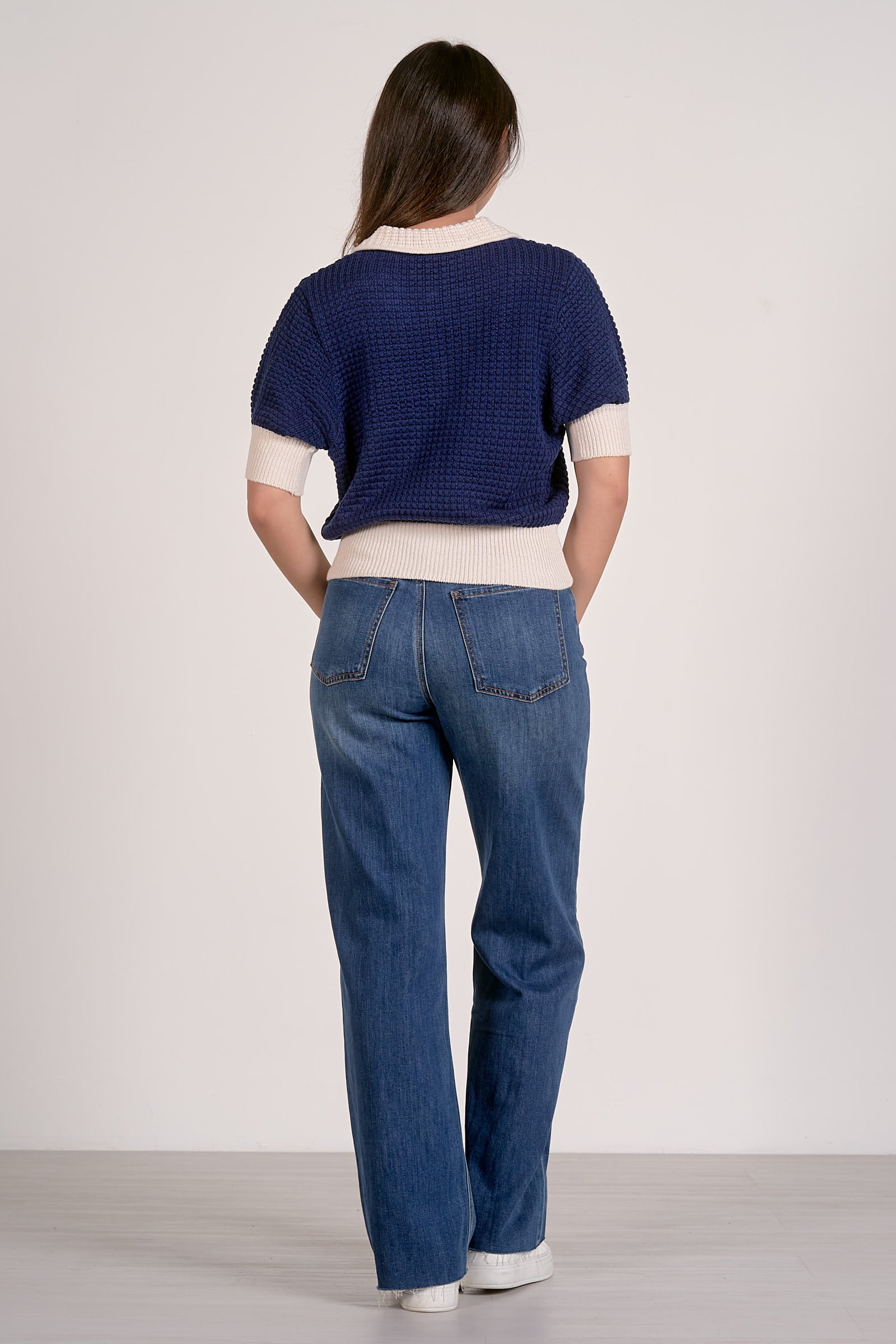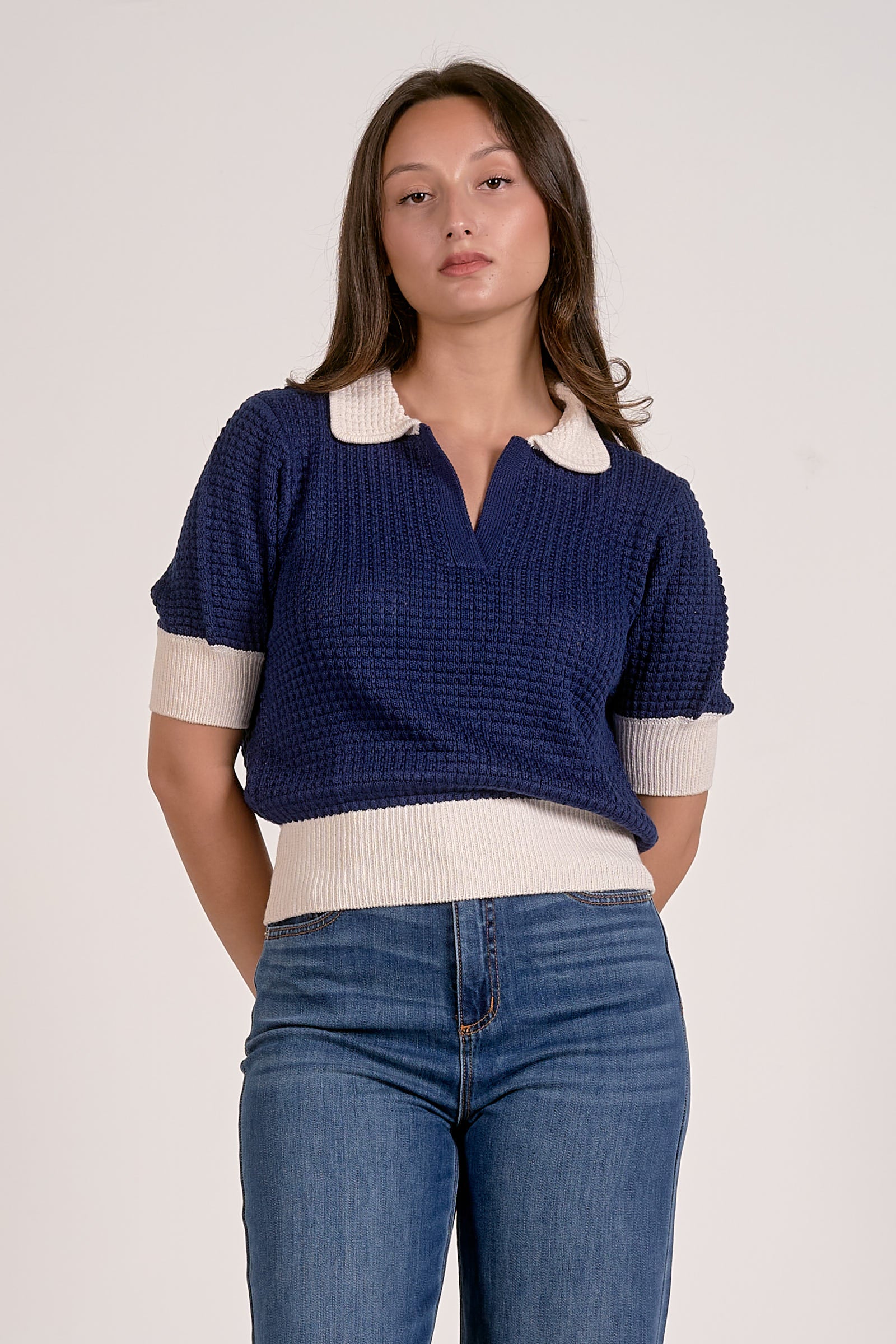Elevate your everyday layering with this refined 3/4 sleeve collar sweater. The cropped sleeve length offers versatile styling options—wear it solo or layer it under jackets and blazers for a polished, intentional look. Crafted with attention to detail, the structured collar adds dimension and sophistication to any outfit. Perfect for transitional seasons and effortless sophistication.