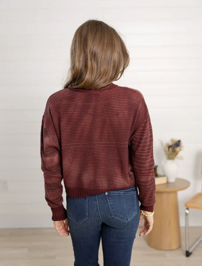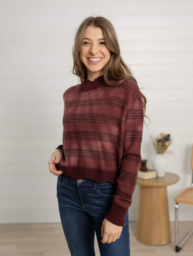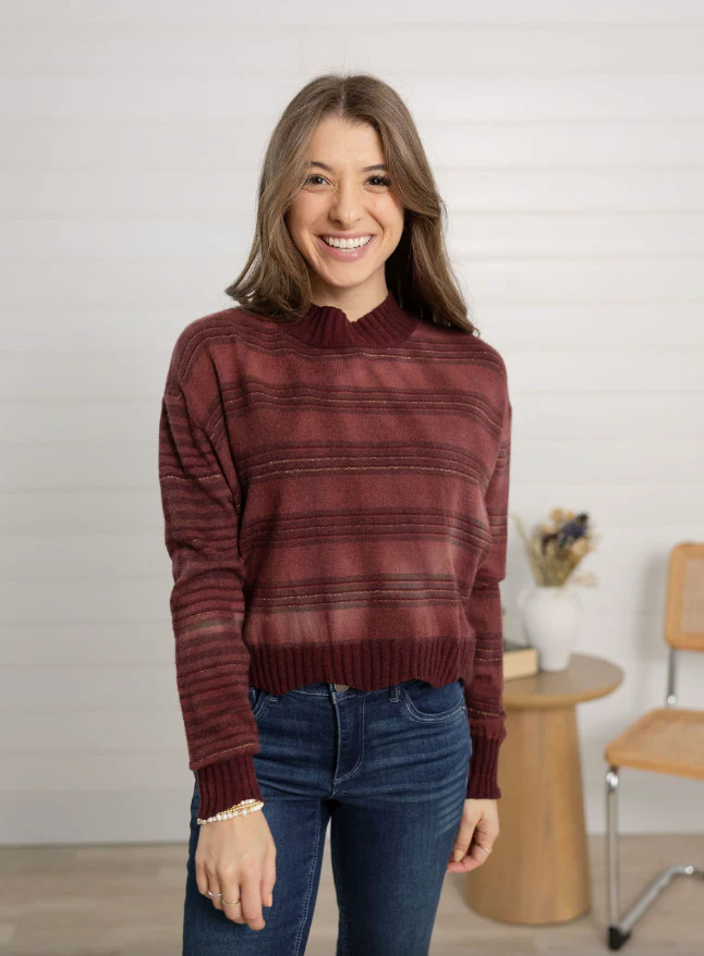 Whether you layer up or wear it on its own, this lightweight sweater is a go-to for every season. It has long cinched sleeves, a mock neck, wavy scallop hem, metallic seaming, and a unique stripe mix tie dye design.