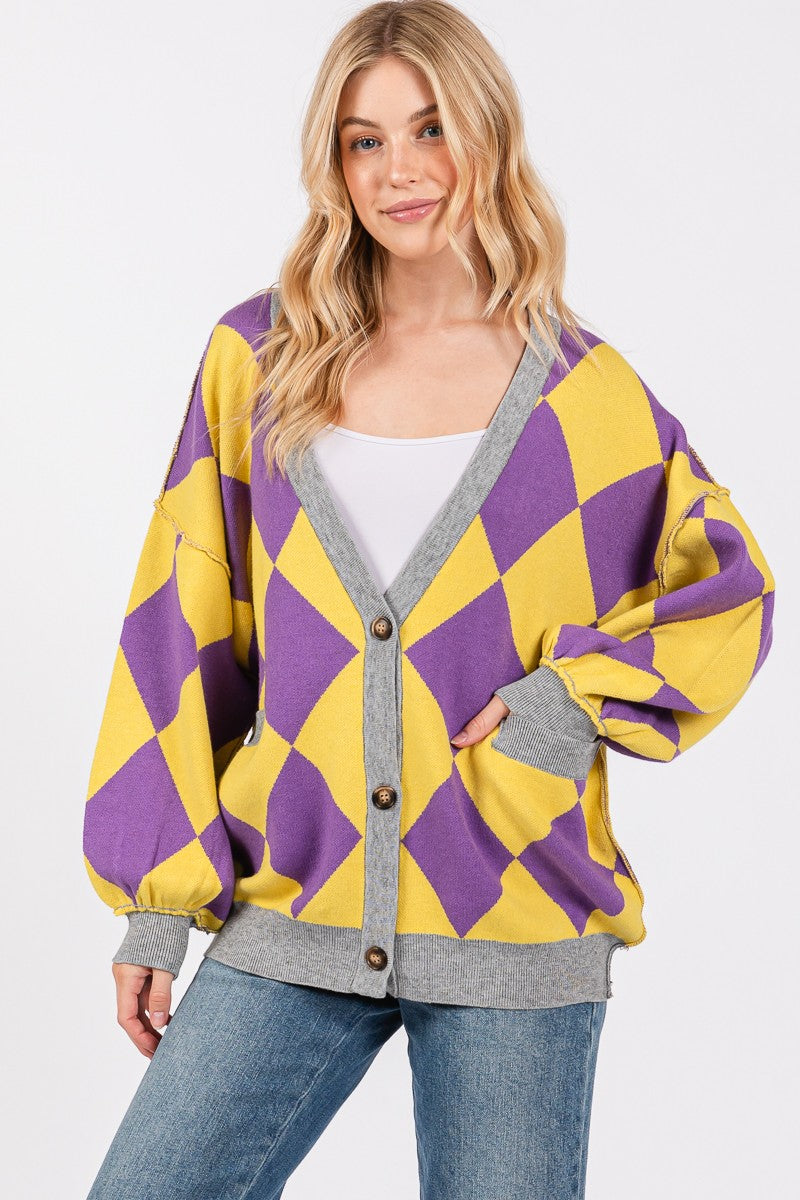 Turn heads in this vibrant oversized cardigan featuring a bold diamond print in eye-catching contrasting hues. Designed with soft knit fabric and cozy drop shoulders, it's detailed with ribbed trim along the hem, cuffs, and deep V-neckline. The relaxed silhouette and front pockets make it both comfortable and functional-perfect for layering over your casual everyday looks or adding a playful pop to your gameday outfit.oversized cardigan, diamond print sweater, bold knit cardigan, cozy knitwear, gameday cardigan, trendy layering piece, statement sweater, slouchy cardigan, v-neck button up, fall layering, boutique style cardigan, comfy and cute sweater, preppy cardigan, colorblock knit.