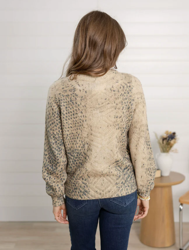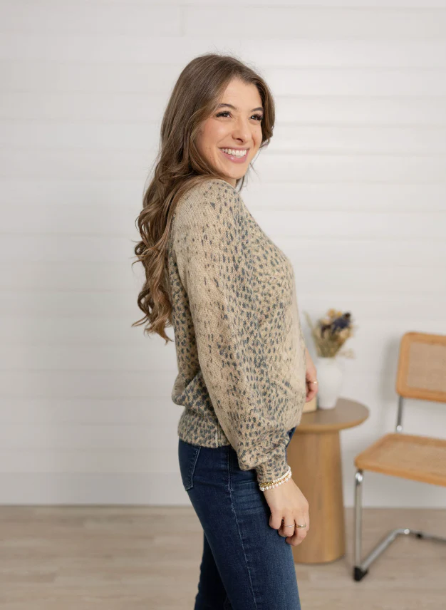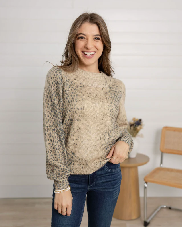Fierce yet feminine, this Printed Pointelle Balloon Sleeve Sweater brings texture and pattern together in one stunning piece. Featuring a subtle pointelle knit throughout and a trendy snake print, the balloon sleeves add playful volume while keeping the look chic and modern. Perfect for layering or wearing on its own for statement-making style.