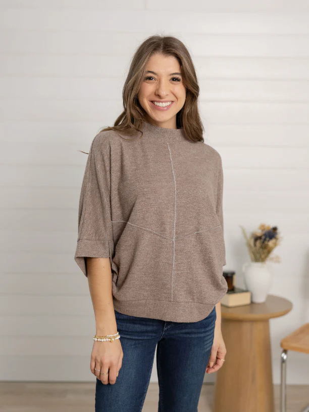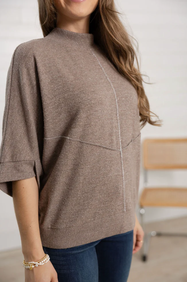 From festive get togethers to everyday errands, add a touch of shine to your day with this knit top. It features three quarter dolman sleeves, a mock neck, banded hem, and metallic seaming detail.