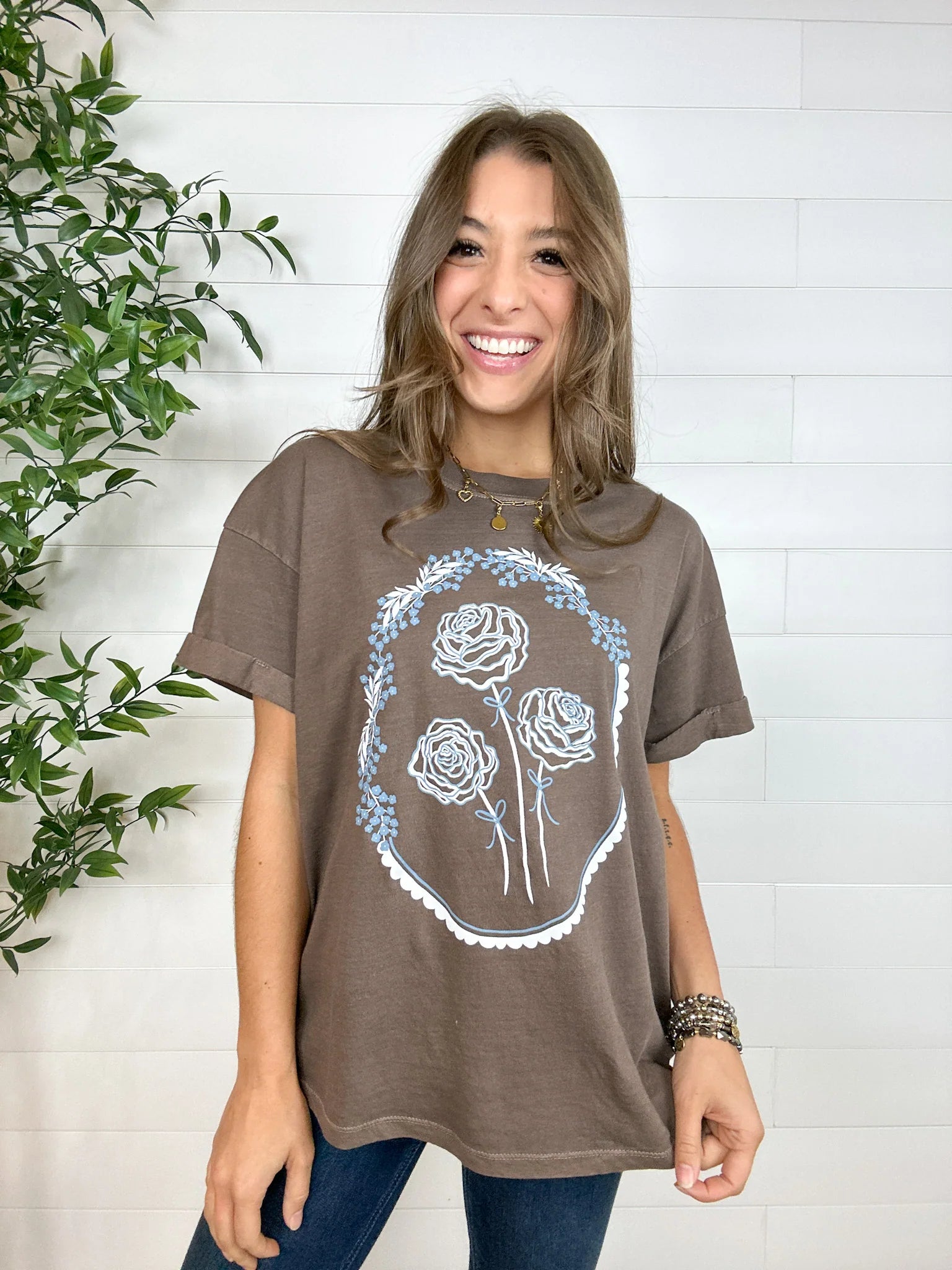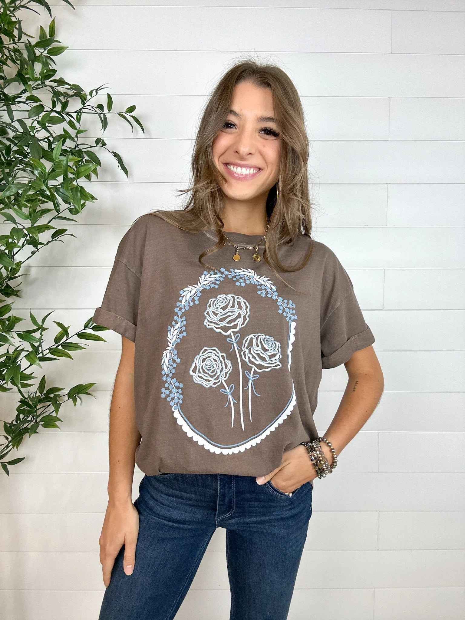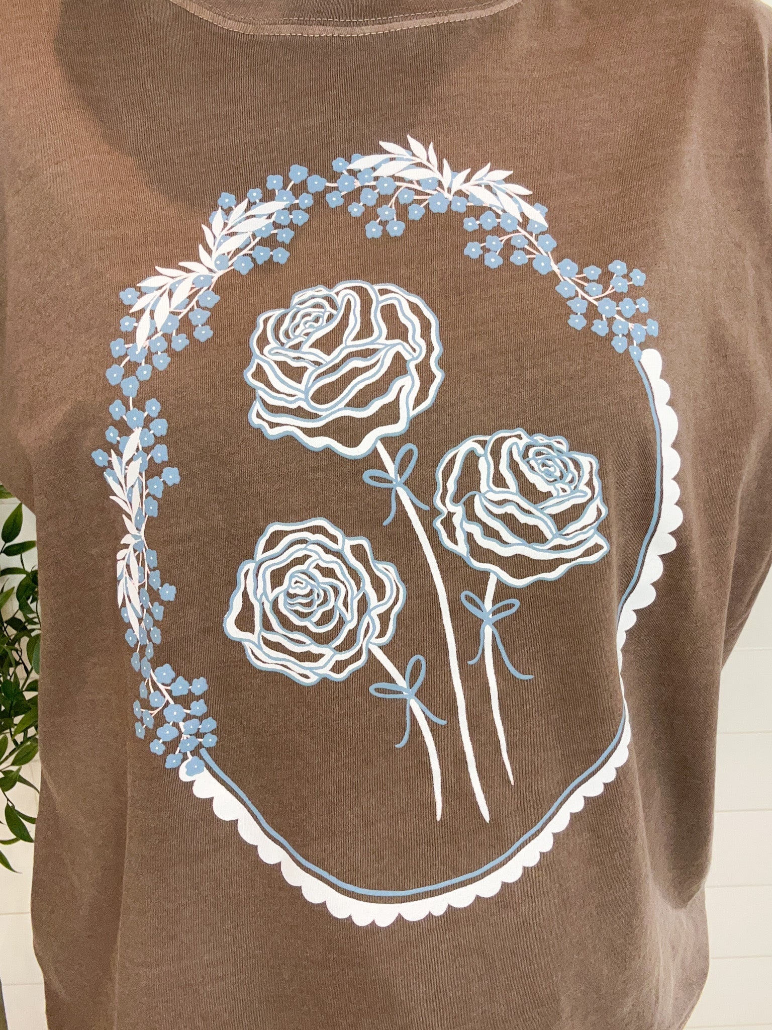 The Mac and Me Floral Wreath Tee brings soft femininity and vintage charm to life. Inspired by Victorian floral-bordered mirrors, this hand-drawn design by Mac features three roses encircled in a delicate wreath — a quiet celebration of beauty, peace, and grace. Set against a warm brown backdrop with white and powder blue accents, it’s as timeless as it is tranquil.