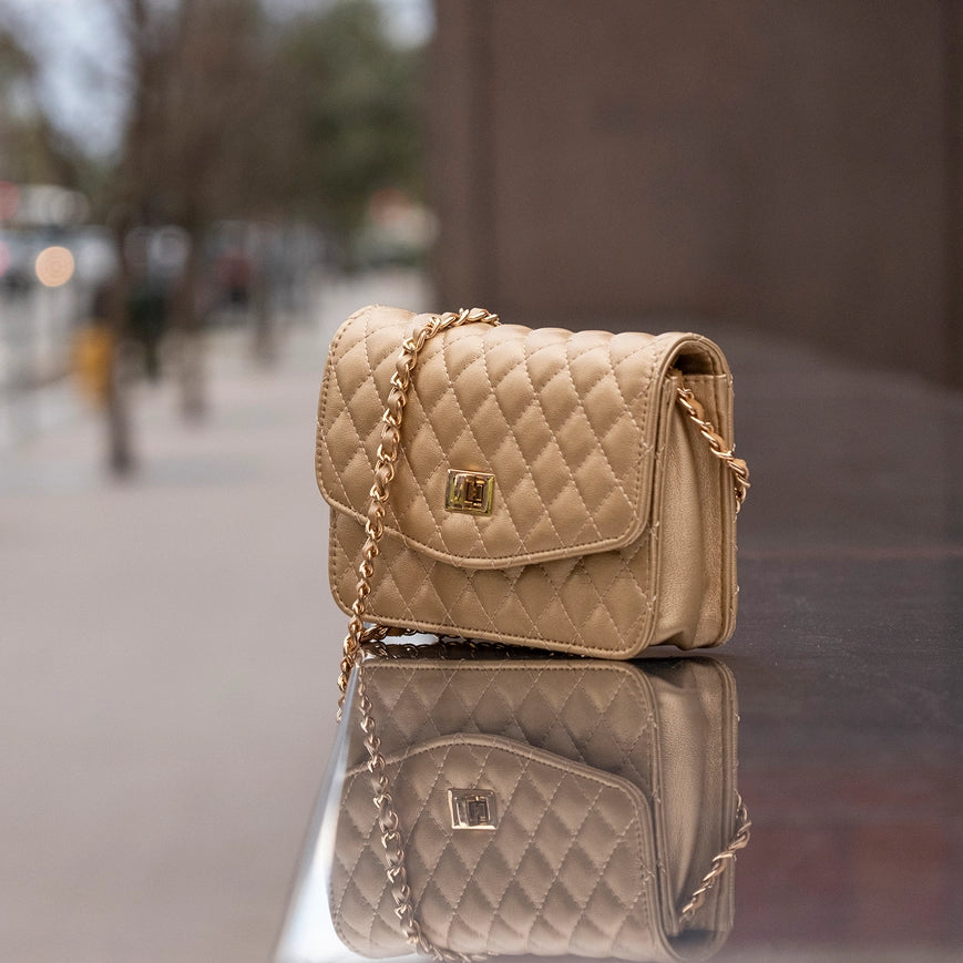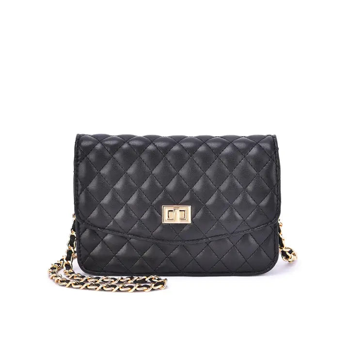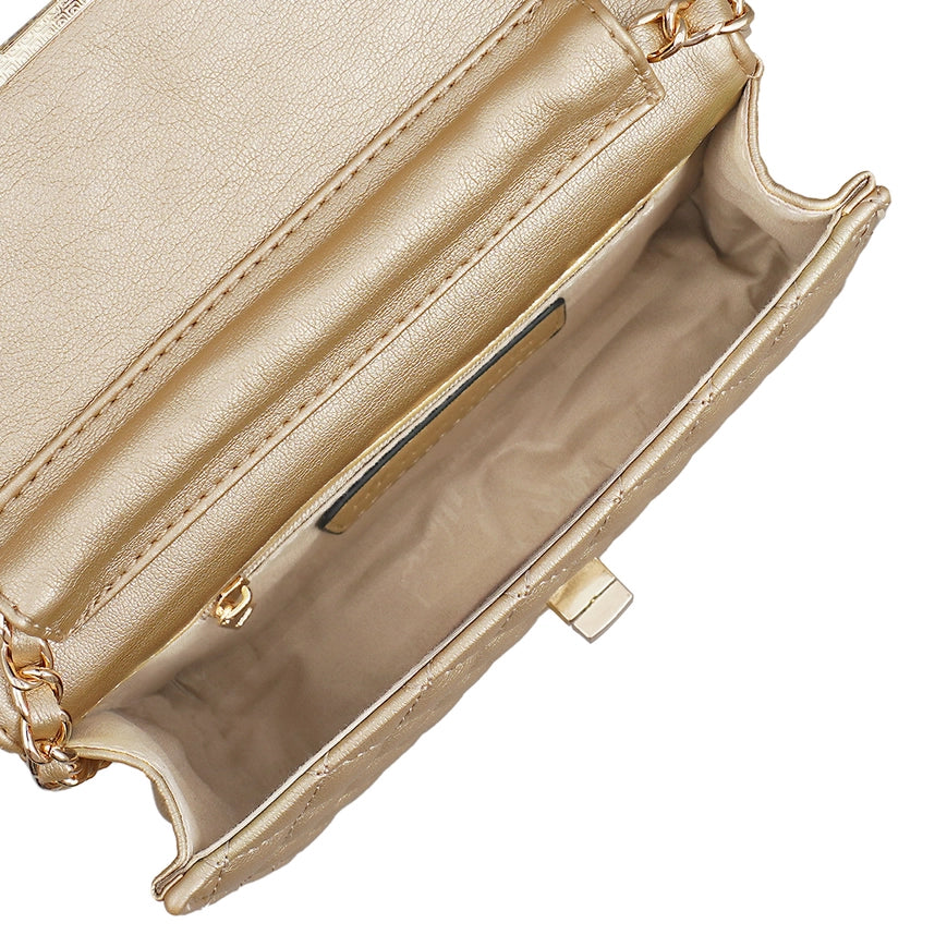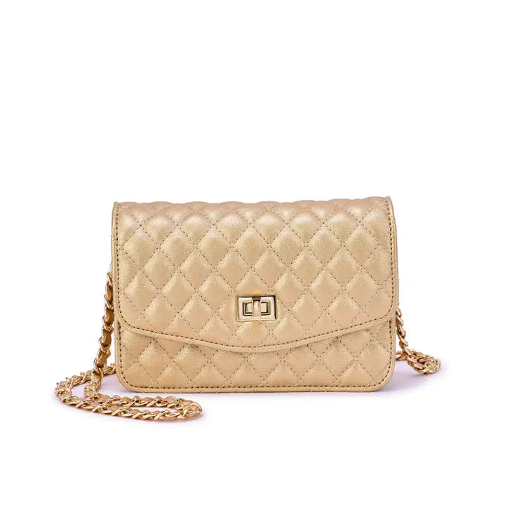 This sassy little clutch boasts a quilted pebble grained exterior and a chain strap for an edgy, up-front look. The turn lock closure adds another hardware forward element to the bag, while the interior has an extra pocket to keep your evenings out a bit more organized. All bags feature quilted exterior, matching topstitching, gold-tone hardware, chain strap and turn lock closure. PRODUCT DETAILS: - Primary Closure Type: Turn Lock - Measurements: 7.5"L x 1.5"W x 5"H - Removable crossbody strap: 21" drop - Interior: 1 zipper pockets - Hardware: Gold-tone - Care: Spot clean - 100% Vegan leather