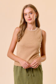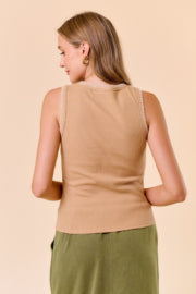 Distinctive blanket stitch trim around neckline and armholes, Premium ribbed cotton blend fabric, Decorative contrast stitching detail, Stretch fabric for comfortable fit. 96%COTTON 4%SPANDEX