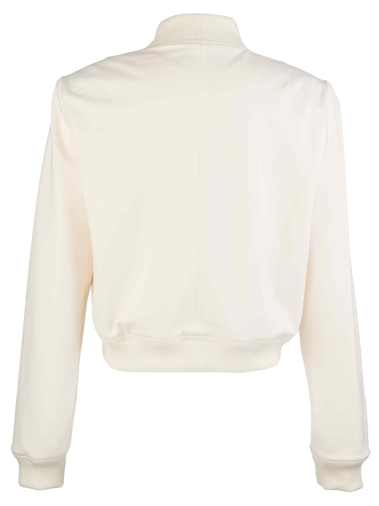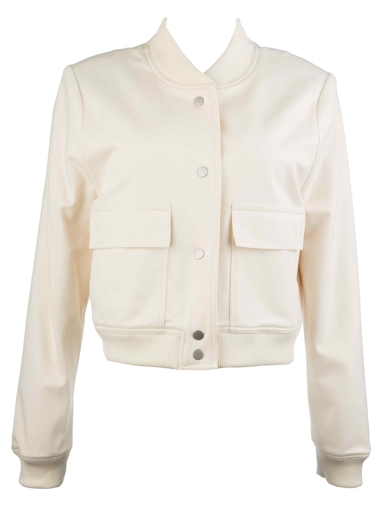 This chic bomber jacket blends classic style with a modern, minimalist design. Featuring a creamy off-white hue, it boasts a structured fit with ribbed cuffs, hem, and collar for a sporty yet sophisticated look. The jacket includes front flap pockets and sleek snap button closures, adding both functionality and flair. Perfect for layering over casual or dressy outfits, this versatile piece is a must-have for a polished and contemporary wardrobe.